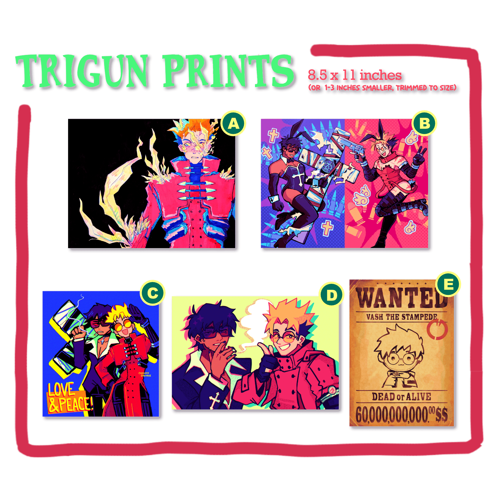 Available Trigun Designs: A) Feathery Vash B) Bunny Vashwood C) Love & Peace D) Vashwood Duo E) WANTED